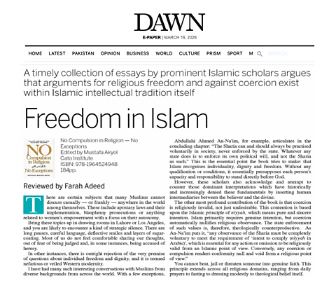 On March 15, Dawn, Pakistan’s oldest and most influential English-language newspaper, ran a review of the new Cato book, No Compulsion in Religion—No Exceptions: Islamic Arguments for Religious Freedom. Titled “Freedom in Islam, and penned by Farah Adeed, a PhD candidate at Boston University, the piece praised the book as a source of “clear, persuasive answers grounded in Islamic tradition” that addresses the thorny question of freedom.